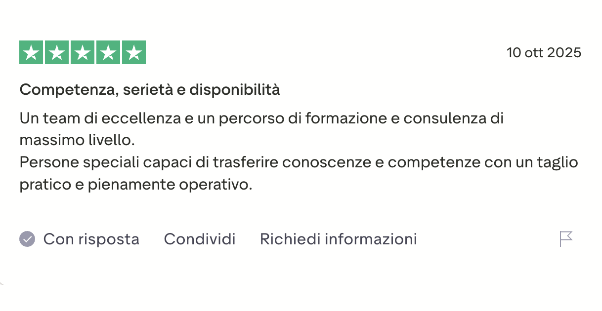 Se dopo l'evento capirai che è il momento di costruire un business davvero profittevole su Amazon, potrai approfondire il percorso di formazione con il supporto di consulenti qualificati e condizioni dedicate.