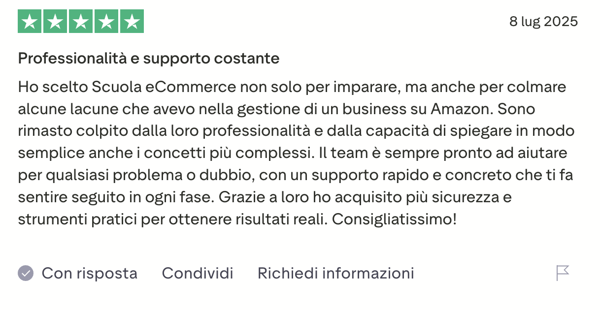 "Uso tanto Amazon per la mia attività, ma per migliorare le nostre performance ho chiesto consiglio a Scuola AMZ, perché è importante farsi consigliare dai numeri uno"