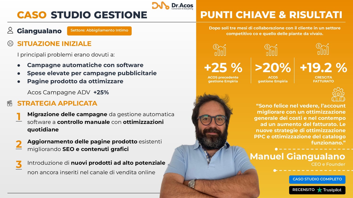 Dal 2017 abbiamo affiancato oltre 2.000 imprenditori, aziende e brand nella strutturazione e nell’ottimizzazione dei loro canali di vendita online, supportandoli nell’integrazione di Amazon all’interno della strategia commerciale aziendale con un approccio orientato a marginalità, controllo e crescita sostenibile.