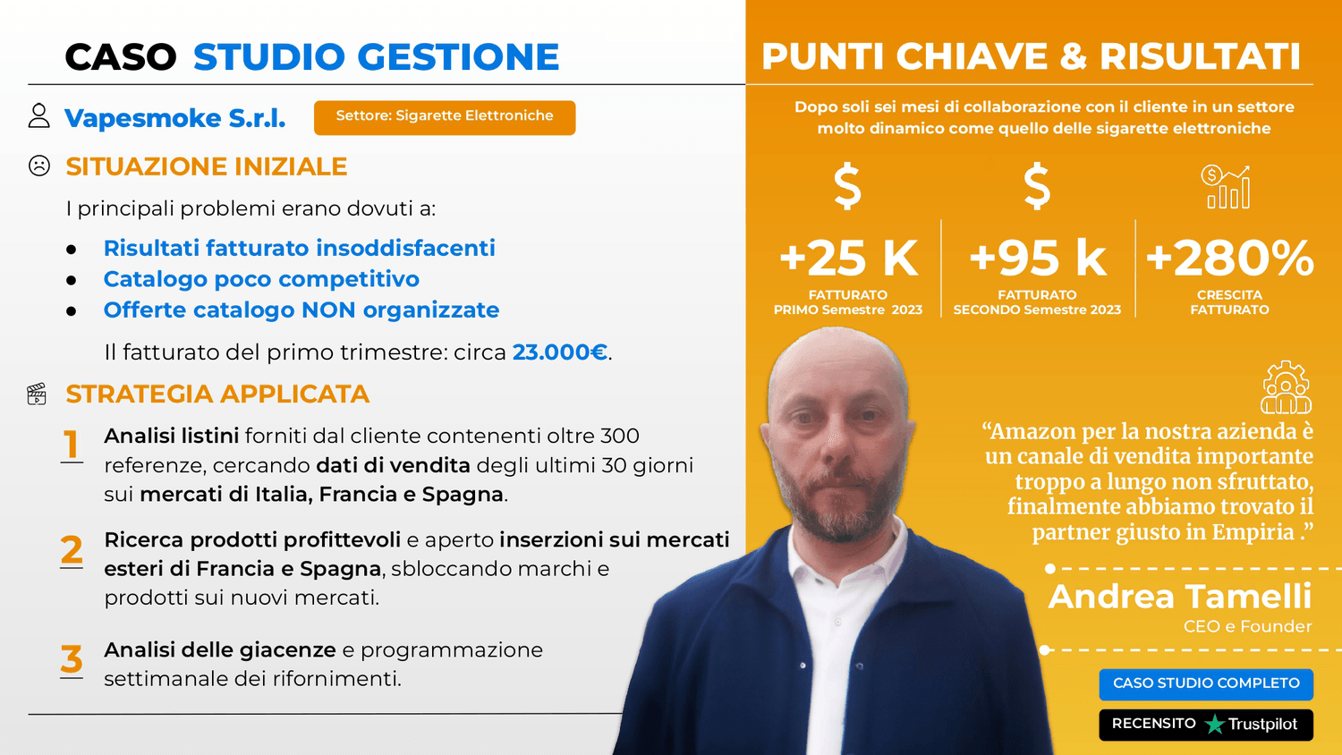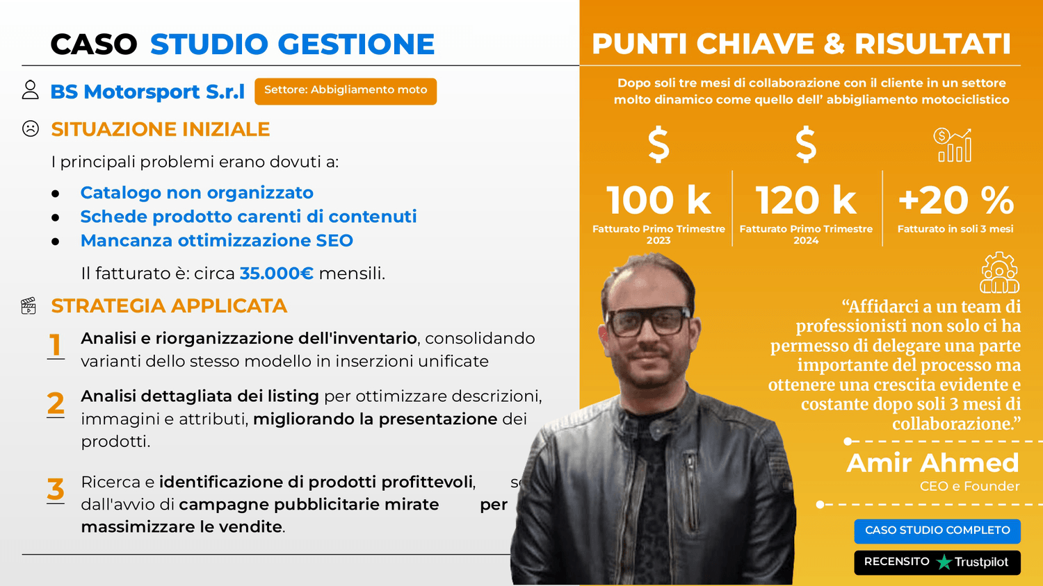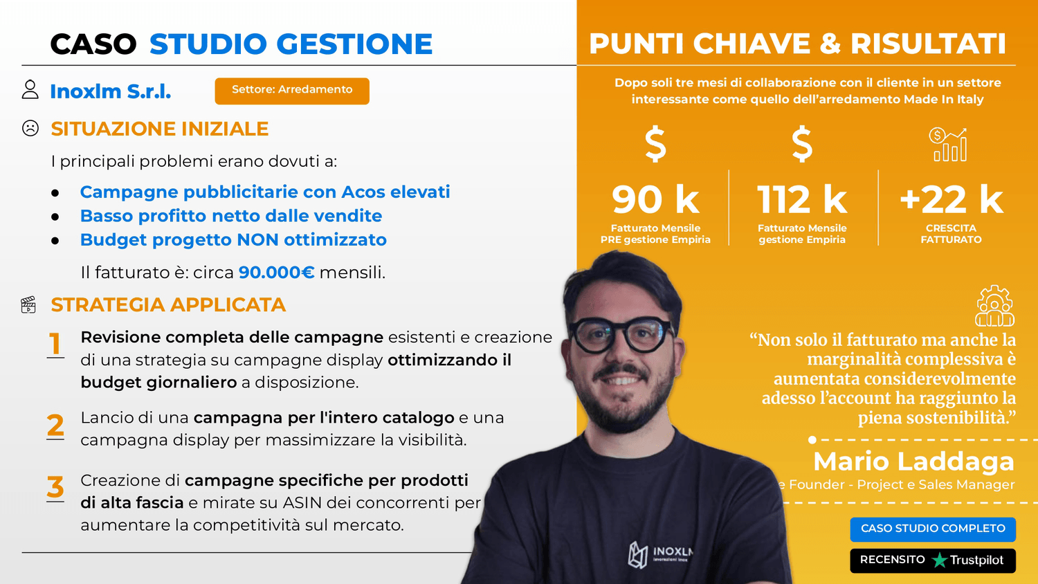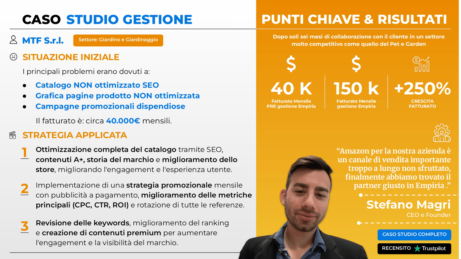 Da allora, abbiamo perfezionato questo sistema aiutando oltre 300 imprenditori a superare il plateau e scalare fino a milioni di euro di fatturato su Amazon.